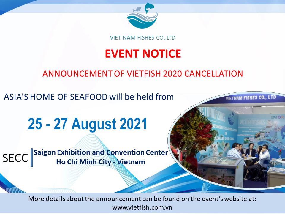 VIET FISH 2020 will be rescheduled to 25 – 27 August 2021 at the Sai Gon Exhibition and Convention Center (SECC) Ho Chi Minh City – Viet Nam.